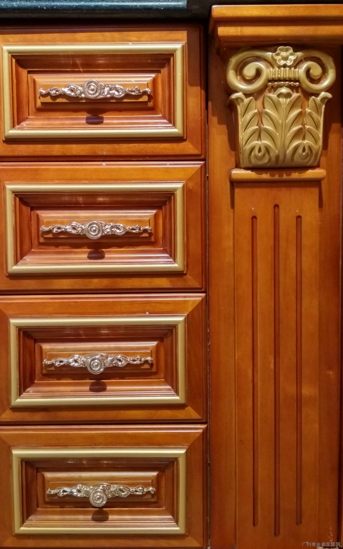 地柜安置了多個緩沖抽屜,可放置一些刀具類和一些不常用的物品,拉手也精挑細選,選擇了金色仿古型拉手,則臺面選擇鉑金黑色石英石,黑色的石英石是較少人選擇的,也只有這款極具歐美風格的實木櫥柜才能自然搭配,打造不一樣的風格,更具傳統感。