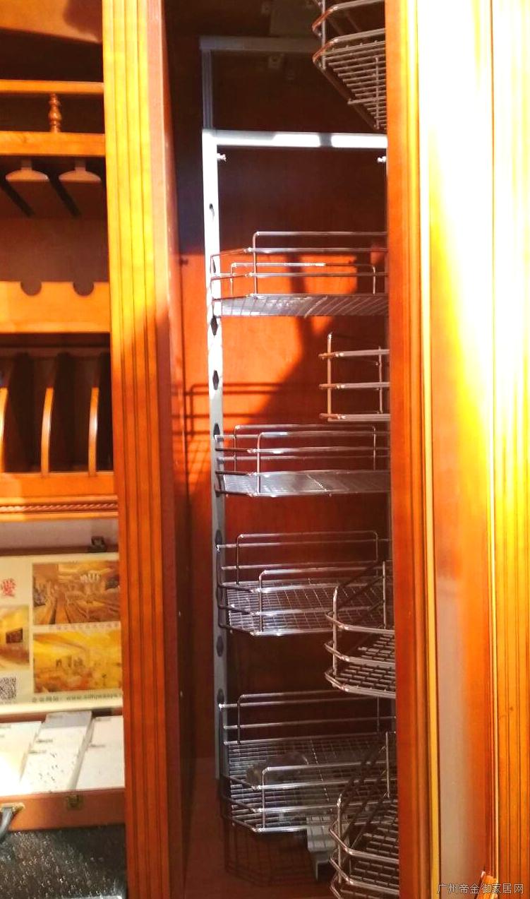 櫥柜右邊高柜安置了高品質拐角拉欄,20萬次開合無聲無噪,可放置一些醬汁、調味醬還有一些不宜放入冰箱的干燥食品,高柜空間較大還可將一些不常用的物品也存放入高柜。