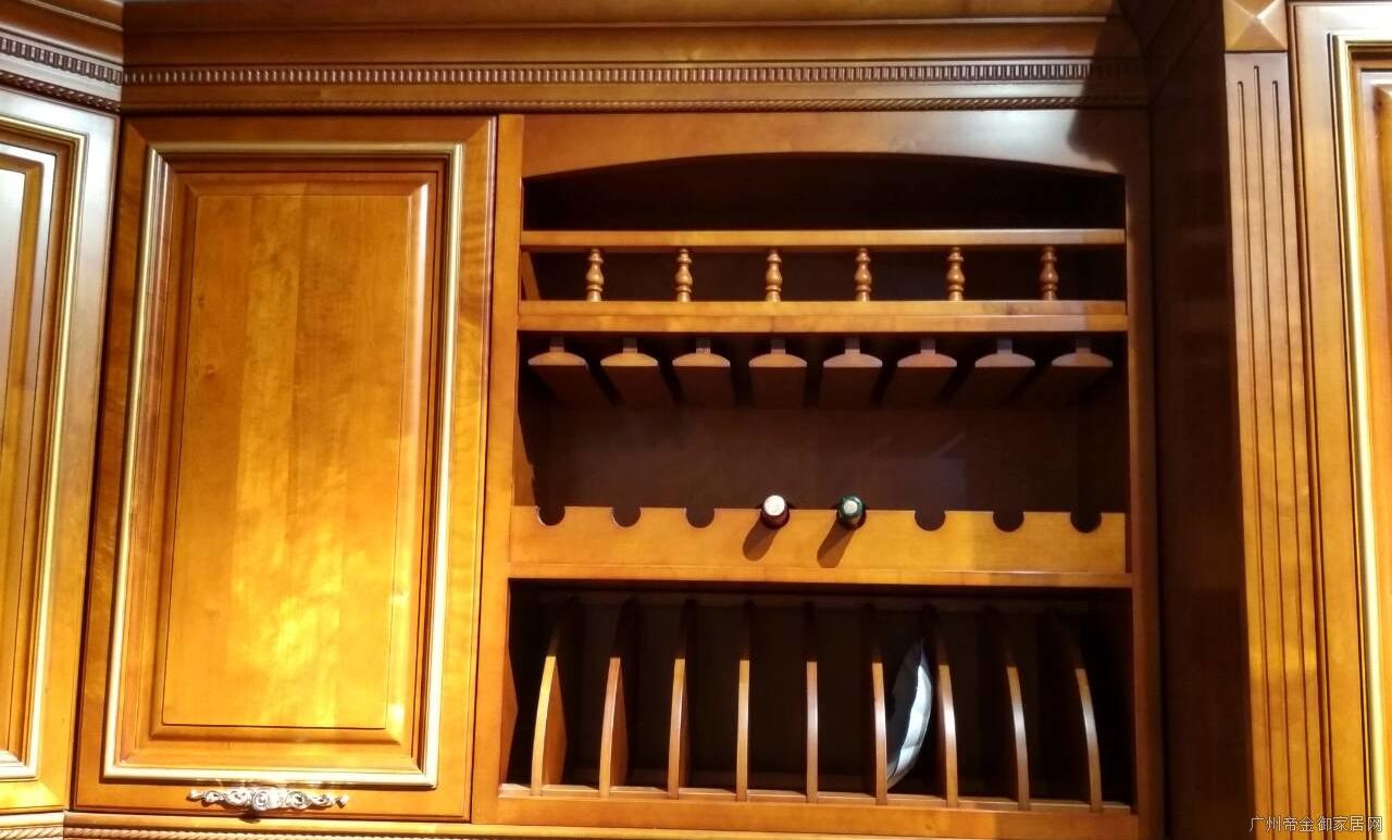 櫥柜右方安置原木紅酒架 ,使紅酒平整置放,保持了紅酒的特性,酒架分上中下三層,上層和中層可放置紅酒,下層則放置碗盤方便拿取。